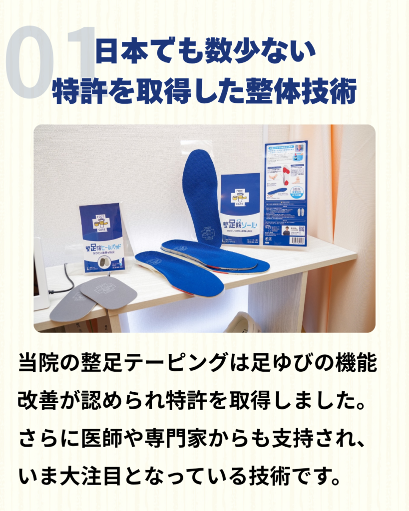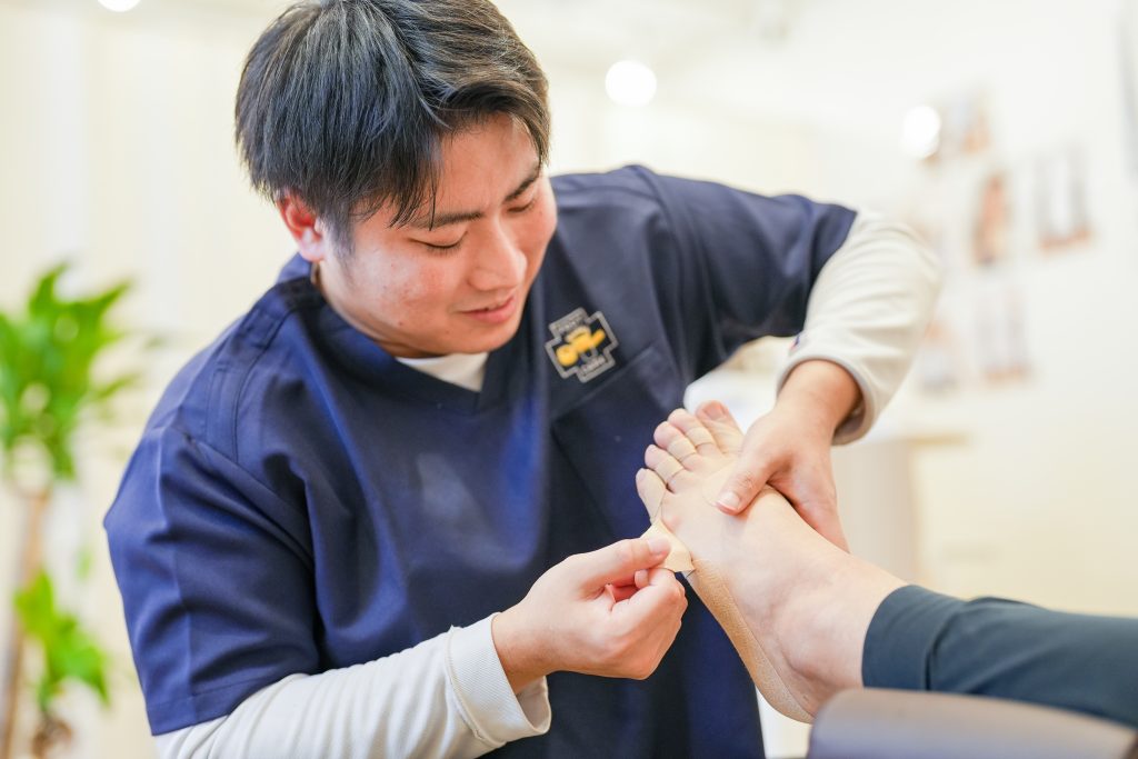 これまで多くの足のトラブルに向き合ってきたスタッフが在籍し、外反母趾・内反小趾・浮き指など幅広い足のコンディションに対応いたします。独自のテーピング技術で、足元のバランスを整え、不調の軽減をサポートします!