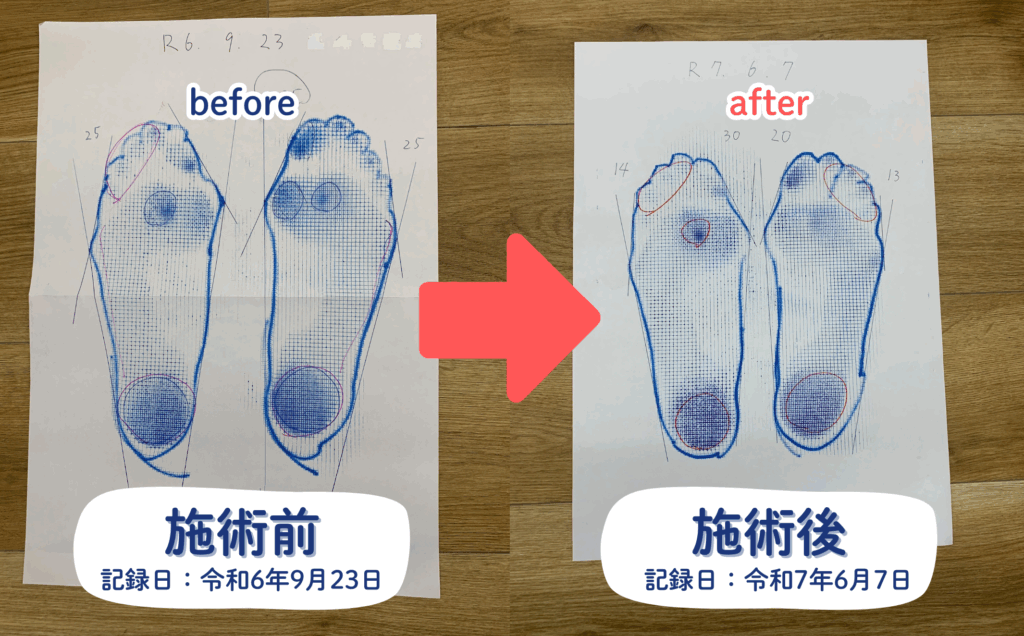 足の形もキレイになってきましたし、指もほとんど使ってなくて浮き指でしたが、動かせるようになりました。土踏まずのあたりが内側に盛りあがっていたのもスッキリしてきました。