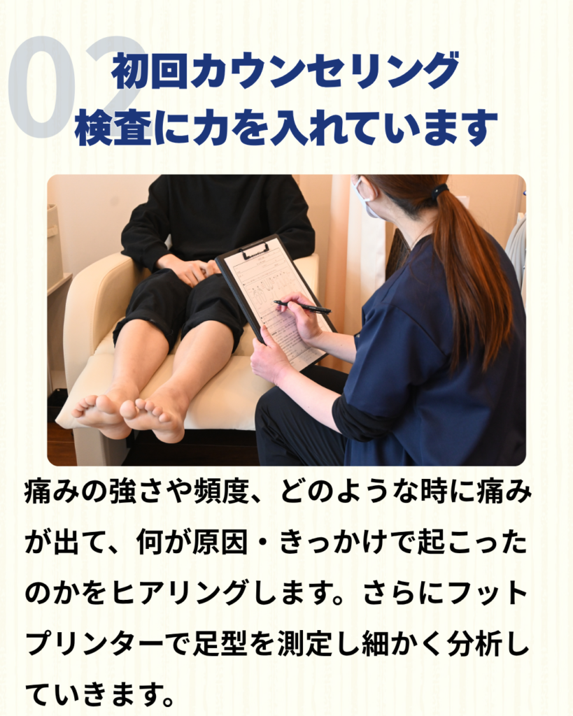 まずは、つらい痛みを少しでも早く楽にしていただくことを大切にしています。「どんな時に痛むか」「いつから痛みがあるか」など、お話をうかがいながら、原因を一緒に探っていきます。専用の足型測定器(フットプリンター)を使って、外反母趾の角度やアーチの状態、重心のバランスを詳しくチェックし、お一人おひとりに合わせた“整足テーピング”を施術いたします。