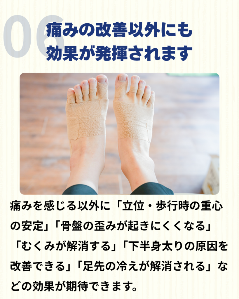 足の機能を正常化させることで、外反母趾の痛みが軽くなります。